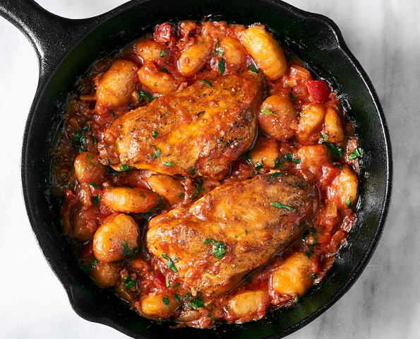 3. Add the chopped tomatoes, chickpeas, salt and pepper and about half of the vegetable stock. Stir well and simmer gently for about 20 minutes adding more stock as needed.