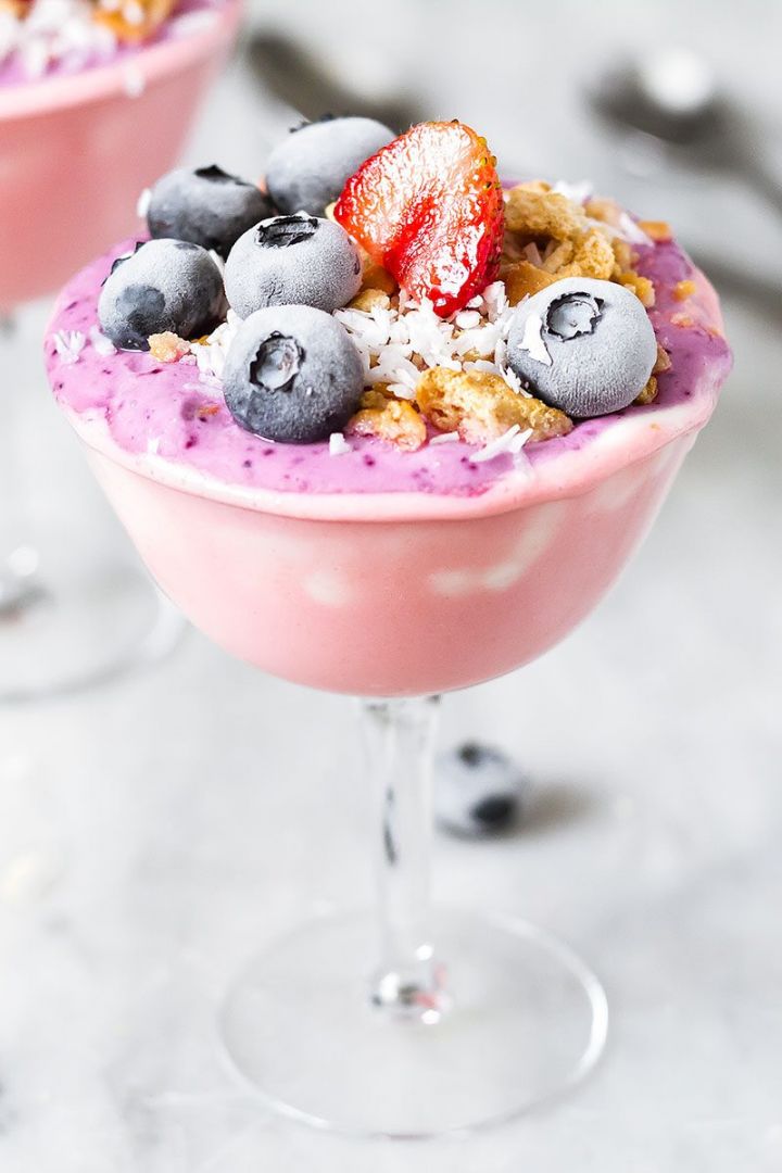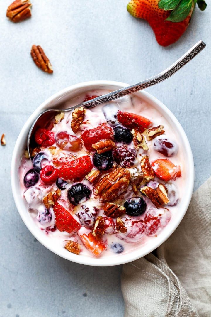 - In a bowl, cut the kiwis and strawberries into pieces and add the raspberries.