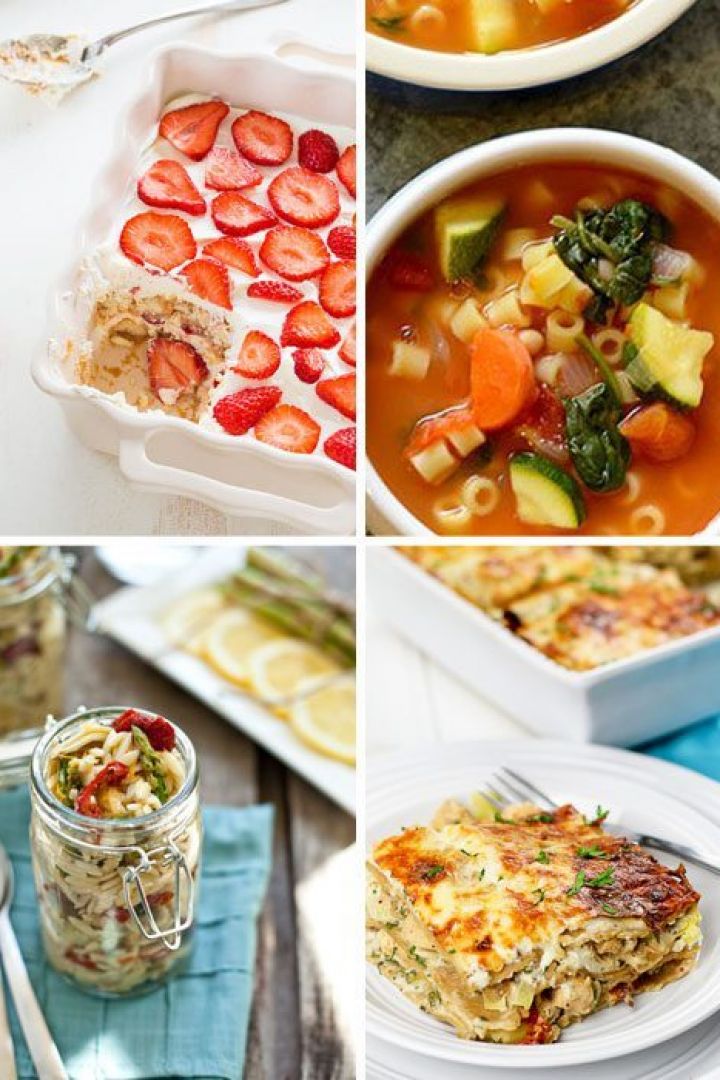 Spring Orzo Pasta Salad, Cheesy Chicken and Artichoke, Strawberry tiramisu, Minestrone Soup