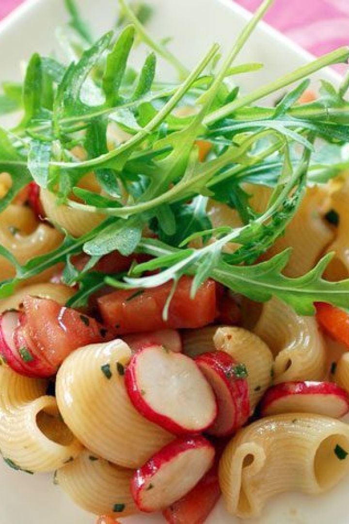 Spring Pasta Salad with Radish, Couscous with Vegetables, Salad with Cold Asparagus, Salmon Pie with Potatoes and Spinach
