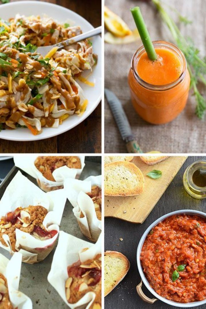 Chopped Thai Chicken Salad, Carrot Juice, Fresh Tomato Dipping Sauce, Strawberry Almond Apple Muffins