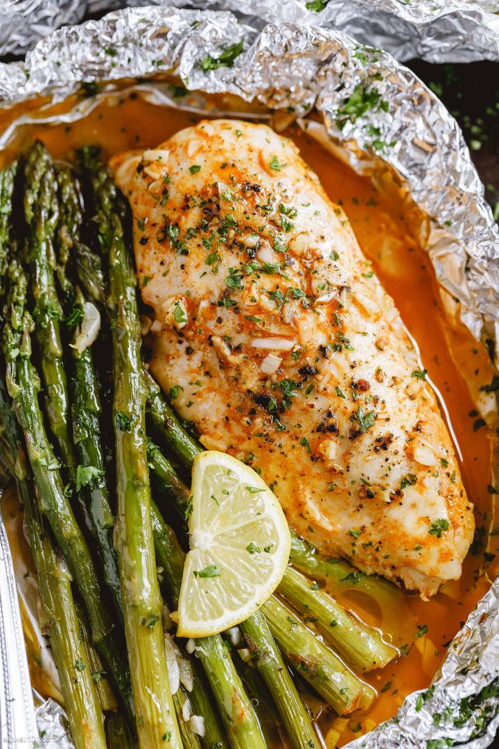 Baked Chicken in Foil with Asparagus and Garlic Lemon Butter Sauce