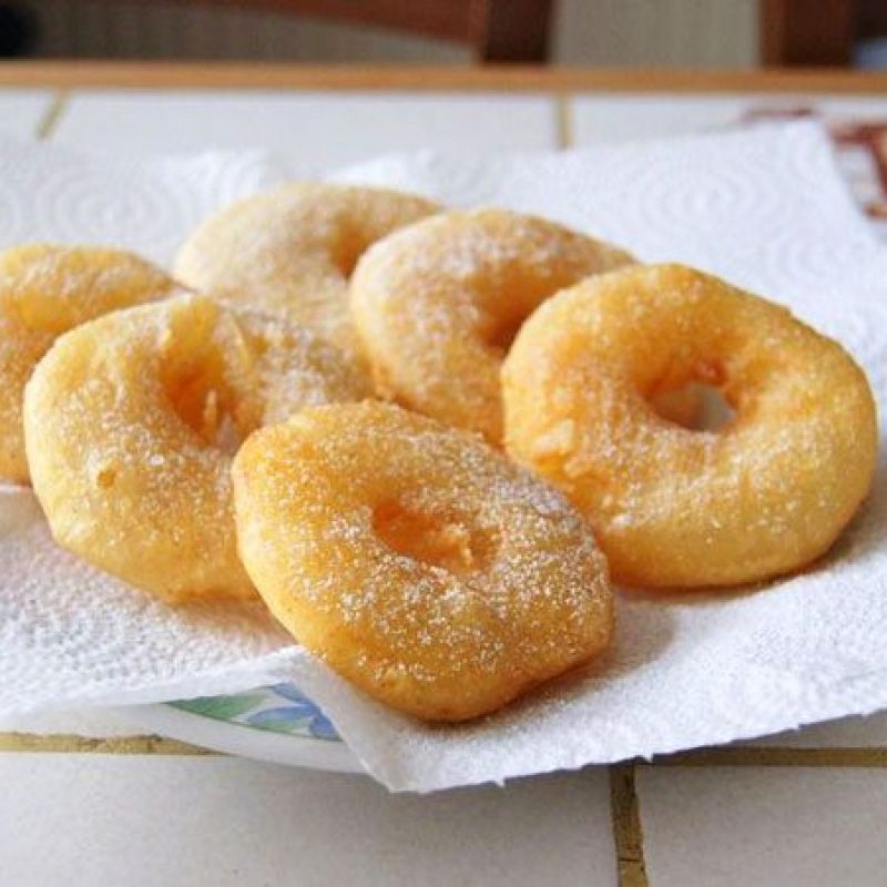 4. Dip a slice of apple in the dough. Drop in the deep fryer. Cook for a few minutes until the rings are golden brown.