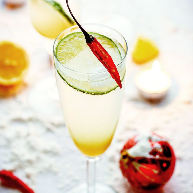 4. Put ice cubes into glasses, limes slices and chili pepper on the edge. Pour the syrup on ice cubes and fill with a dash of vodka (optional) and sparkling water to the top. Serve your Holiday green apple cocktail immediately – enjoy!