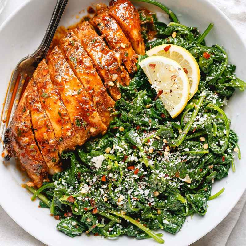 6. Divide sauteed spinach into plates or bowls and arrange sliced chicken breasts. Drizzle with the sauce. Serve the chicken and sauteed spinach garnished with lemon slices, and fresh chopped parsley. Enjoy! Add an extra splash of lemon juice and sprinkle some grated parmesan (optional) over the spinach before serving the Asado chicken breasts and spinach. Enjoy!