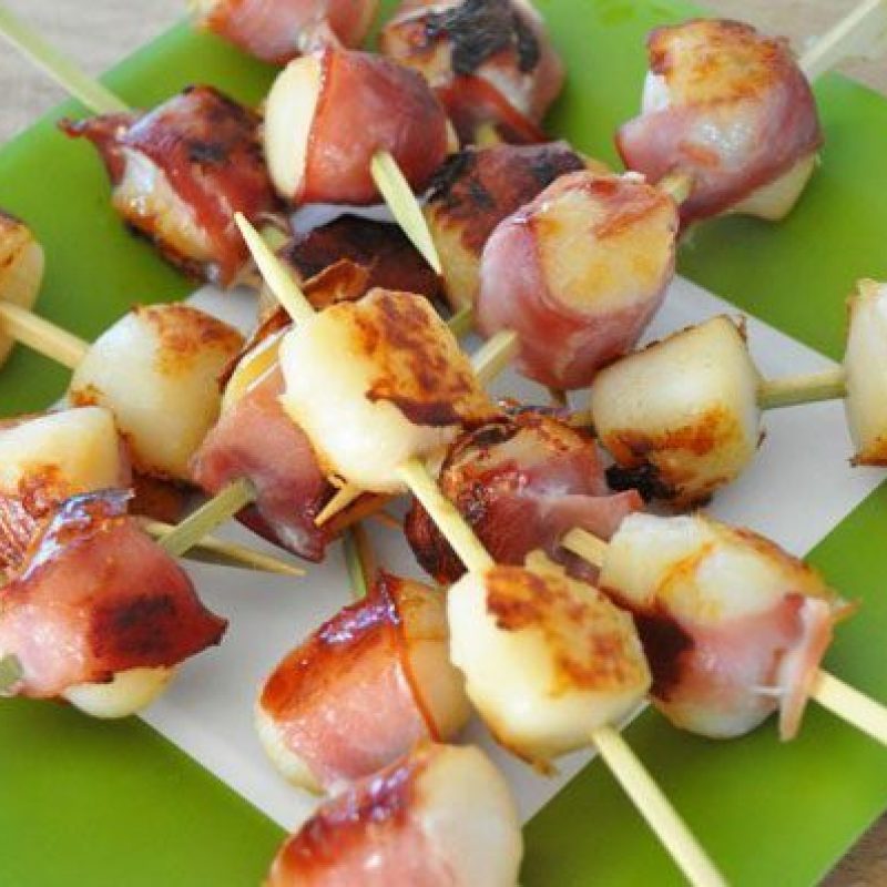 1. Wrap sea scallops in a thin strip of bacon and prick on a wooden skewer — small bamboo skewers are great for that.
