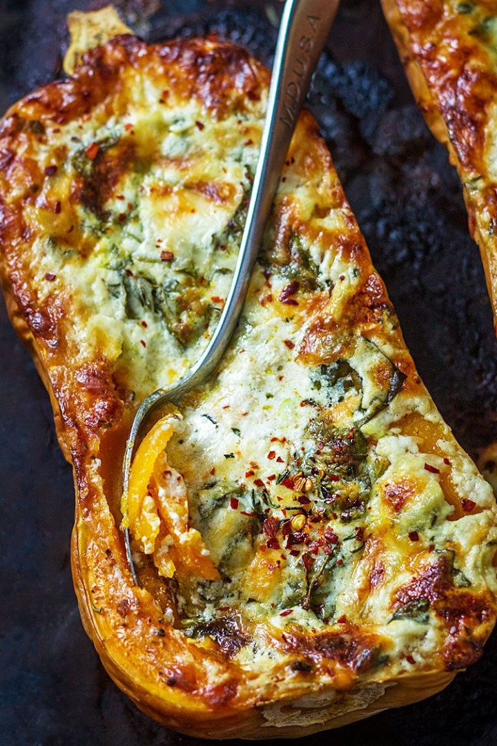 9. Spoon the stuffing into the eggplant skins. Make a little dig in the middle.