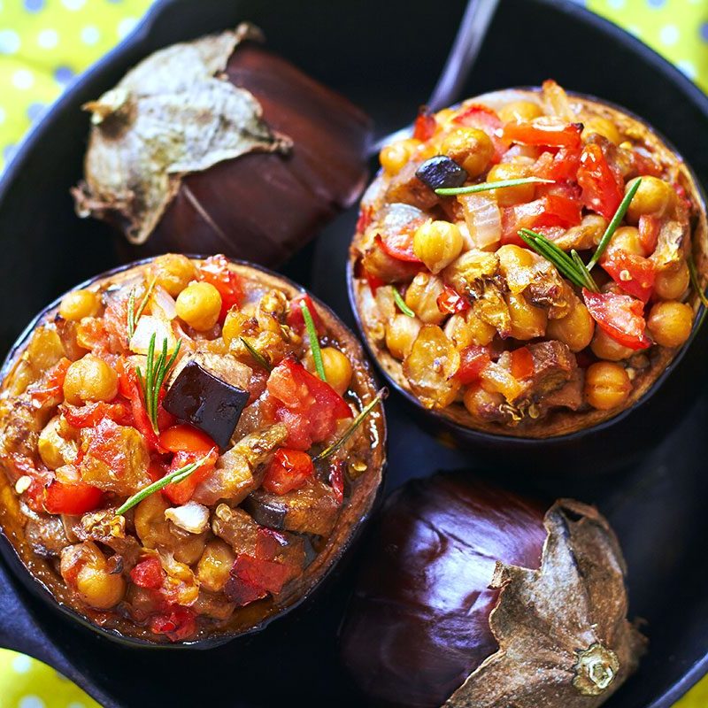 Here’s a super healthy meal loaded with plant-based protein to serve for dinner. Eggplants are stuffed with a delicious combination of chickpeas and tomato, then baked in the oven. We are sure that both vegans and meat eaters will love it. Easy to do and no cleanup, try it now!