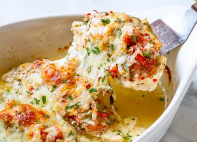 Chicken Casserole with Pickled Chili, Mozzarella & Pepper JackThis baked chicken breast casserole is fresh out of the oven in less than 30mn.