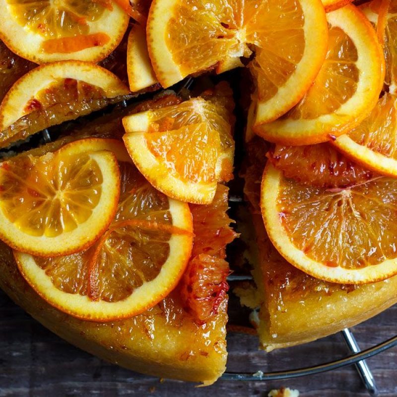 Blood oranges are awesome in this gorgeous pound cake. An intense orange flavor comes from three doses of orange – in the cake itself, the soaking marmalade and the candied orange slices on top. This dessert is even better the next day!
