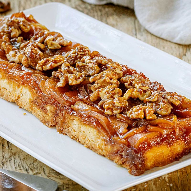 7. Let the baking pan cool on a wire rack for 5 minutes then carefully invert the apple cake onto a rimmed serving plate. Decorate with toasted walnuts, and drizzle with more of the caramel, if you like. Allow to cool for a couple of minutes before slicing. Enjoy! ❤️