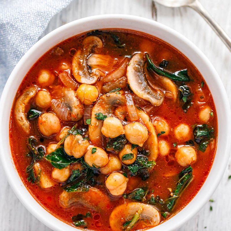 1. To make the chickpea kale tomato soup: Heat oil in a large pot or Dutch oven over medium heat. Add the onion, garlic and saute until tender and fragrant, about 3 minutes. Add mushrooms and saute for 3 minutes more.