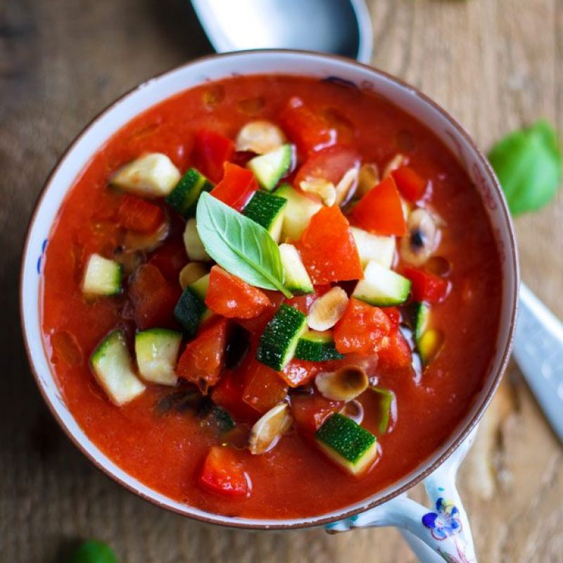 2. Adjust seasoning with salt and pepper. Serve with basil, toasted almonds and remaining diced vegetables.