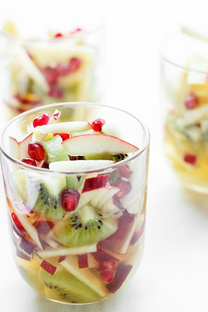 2. Chill until serving. Serve cold, garnished with the mint, mango and kiwi cubes.