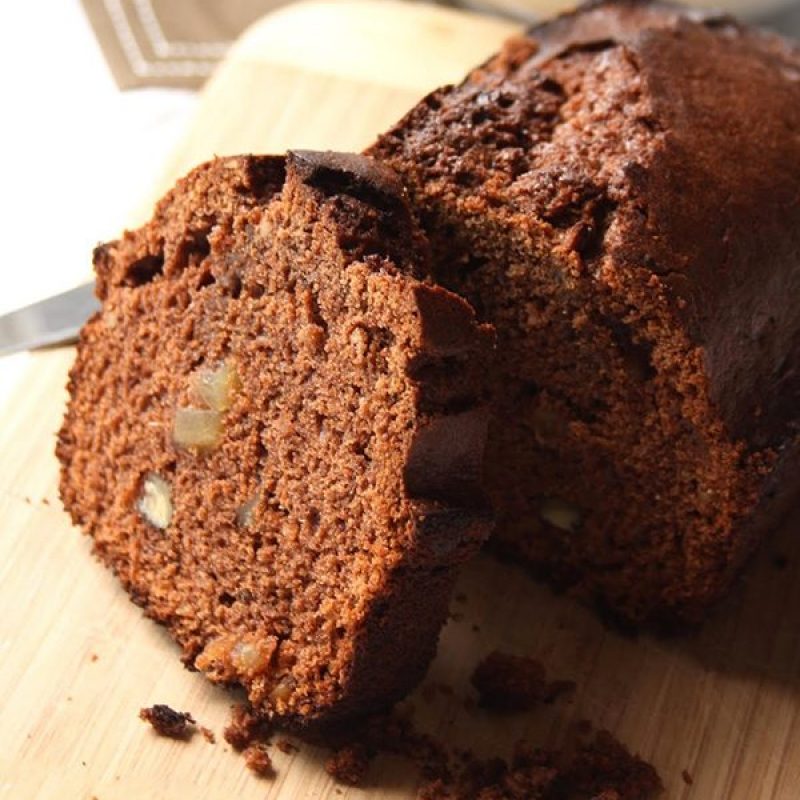 Now here’s the recipe to illustrate: a chocolate nut bread that offers a happy association with chocolate and nuts. The sweet and tangy candied ginger can surprise sometimes… There it fits perfectly in this chocolate bread.