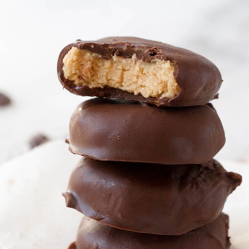 4. Using a fork, dip each “peanut butter fat bombs” into melted chocolate to cover completely. Gently tap the fork to drip of the excess of chocolate. Since the peanut butter mixture softens really fast at room temperature, we suggest you work in batches, keeping peanut butter in the refrigerator as much as possible. Place chocolate fat bombs on the parchment paper lined tray. Refrigerate until the chocolate has completely set.