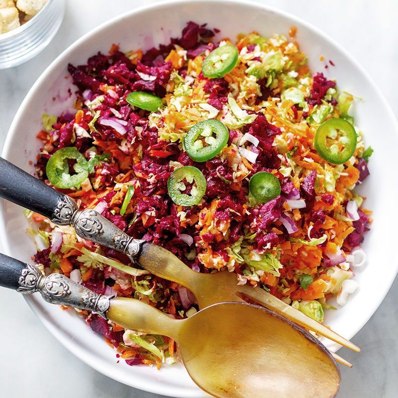 For a healthy lunch on the go, this shaved brussels sprout salad with beets and carrots has you covered. Brussels sprouts, beets, carrots and jalapeño offer complementary textures and flavors while the garlic-yogurt vinaigrette packs a refreshing punch. Add crunchy croutons for good measure, and you get a clean eating favorite you can enjoy anywhere, anytime!