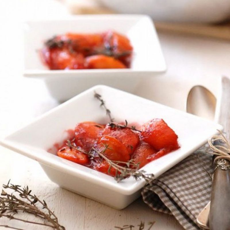 Cooked peaches and raspberry coulis flavored with thyme: this is exactly how to cook a healthy dessert and recycle peaches that have begun to ripen. Not only this peach dessert is quick and easy to do, but it is also a real delight. You can also make this recipe with nectarines for a change.