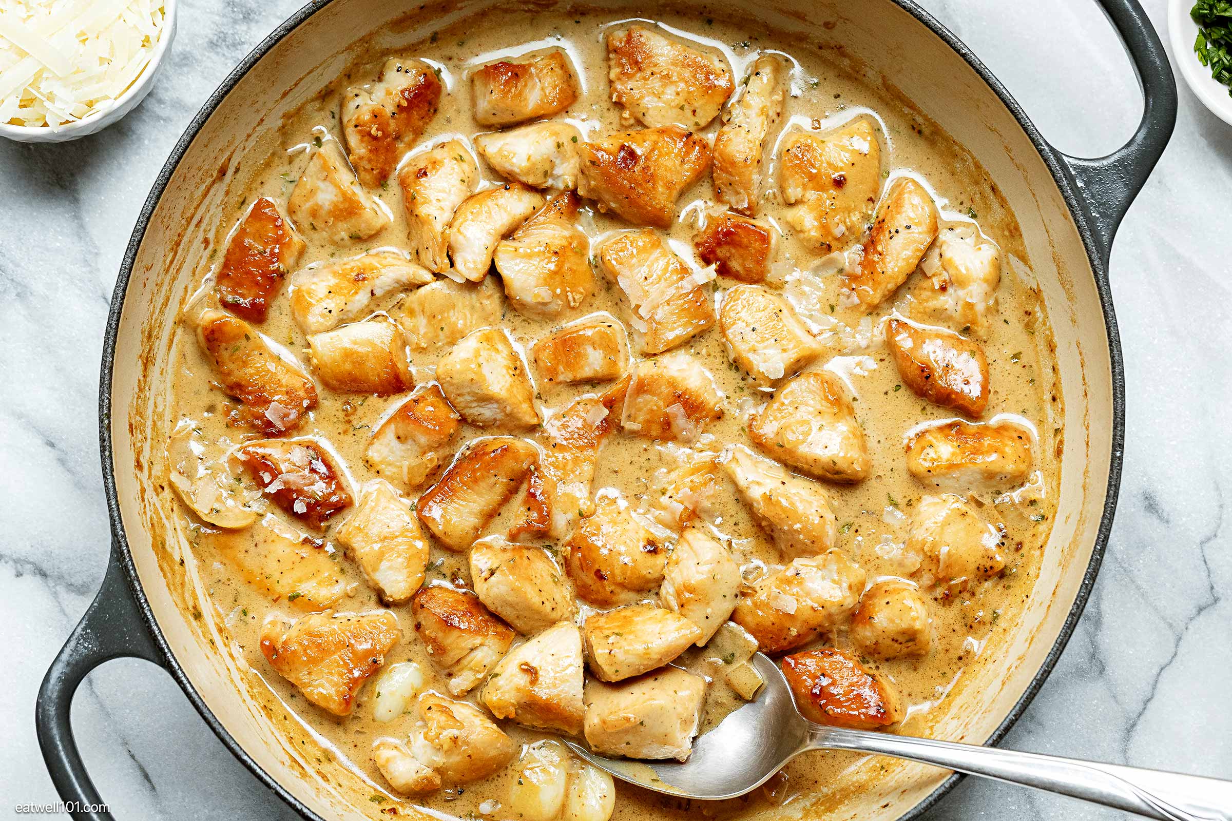 These creamy chicken bites are quick, comforting, and versatile — perfect with mashed potatoes and greens for a cozy, balanced dinner!