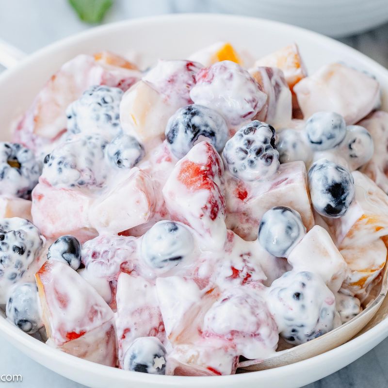 Delicious, creamy, and oh, so sweet! This creamy fruit salad recipe combines perfectly with its amazing combination of fresh fruit. Blueberries, strawberries, blackberries, raspberries, and sweet peaches, tossed in a creamy sour cream–vanilla dressing. It is so simple to throw together! Perfectly balanced in taste and texture, this creamy fruit salad is a wonderful treat for all occasions – from a refreshing dessert to a crowd-pleasing potluck fare. Enjoy!