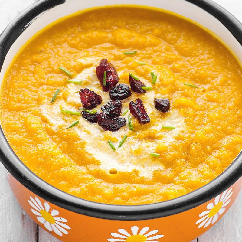 3. Puree soup until smooth using a blender or immersion blender. Return soup to the pot and stir in 1 cup coconut milk then adjust seasoning if needed. Serve warm in bowls. Sprinkle the tops with dried cranberries and garnish with fresh chopped chives.