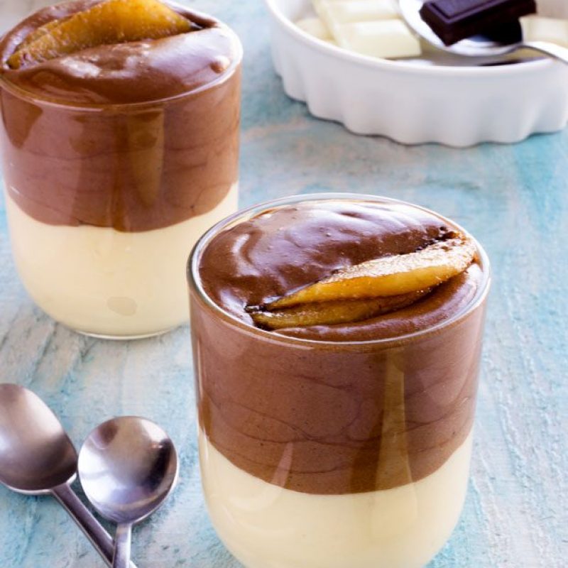 So easy and delicious—In this high-contrast, amazing looking dessert, white and dark layered chocolate mousse is topped with deliciously caramelized pear slices. This treat is so light an fluffy your guests will ask for more!