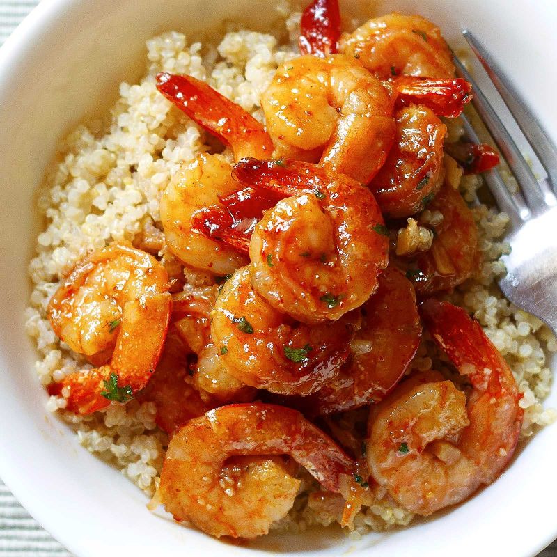 4. Garnish the honey garlic shrimp with fresh chopped parsley and red chili pepper flakes, then serve over quinoa or rice. Enjoy! ❤️