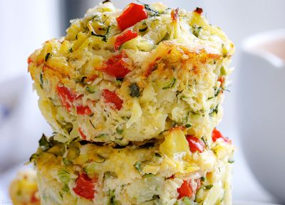 Cheesy Zucchini Egg MuffinsA vegetarian twist on the basic egg muffins recipe featuring zucchini, bell pepper, potato and scallion.
