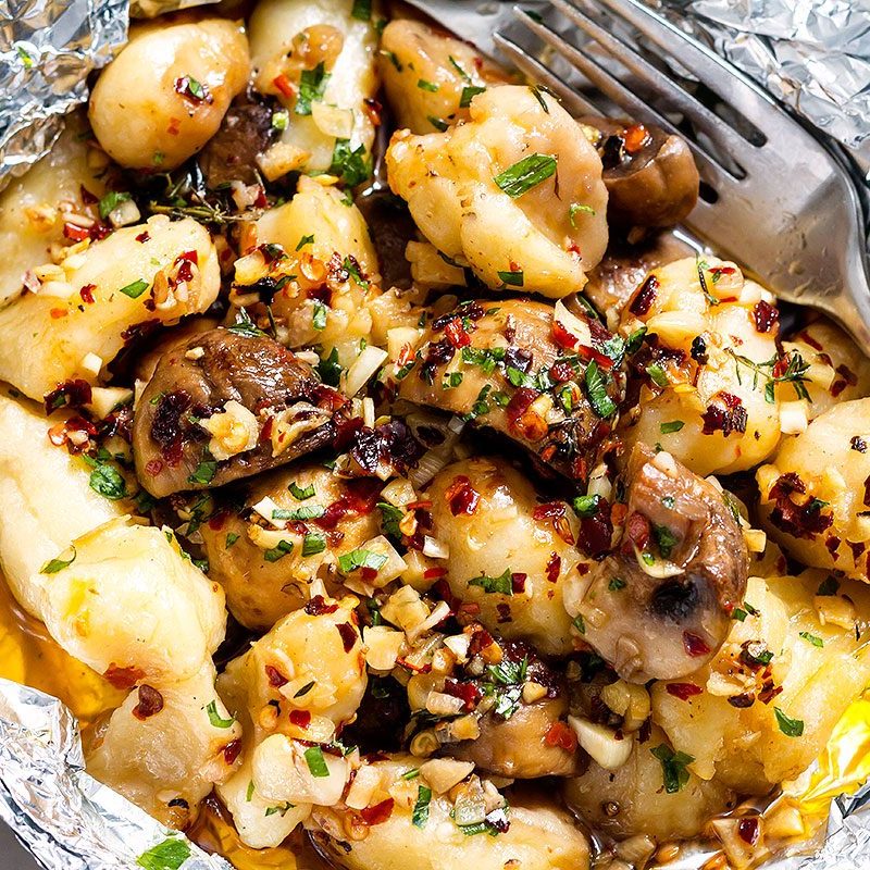 2. Put the mushrooms and gnocchi in the center of the foil. Drizzle with the garlic butter sauce and bring the edges of the foil together and fold to seal, leaving some room for steam. Bake in the oven for 15-20 minutes.