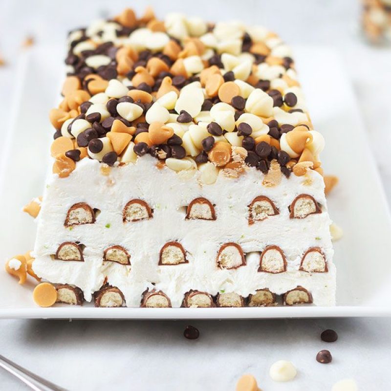 Unique, regressive—this is a new breed of refrigerator cakes, and such an easy dessert to whip up. Milk chocolate Fingers biscuits are layered with a mix of cream, cottage cheese, and mascarpone, flavored with lime and vanilla, stacked into a slab, sprinkled with chocolate chips, and frozen for a fancy, no-bake dessert. The hardest part? Waiting while it sets up in the freezer! You’ll love it, yum!