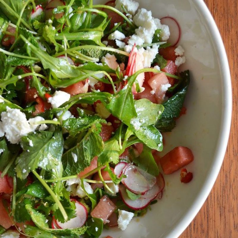 2. Dispose watermelon, radishes, cilantro, mint and arugula into plates.