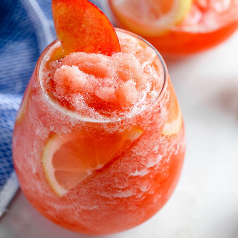 Frosted Peach Lemonade – Turn up summer with this frosted peach lemonade drink packed with the flavor of juicy peaches and zesty lemon. This refreshing drink is the perfect thirst quencher on a hot summer day. Enjoy!