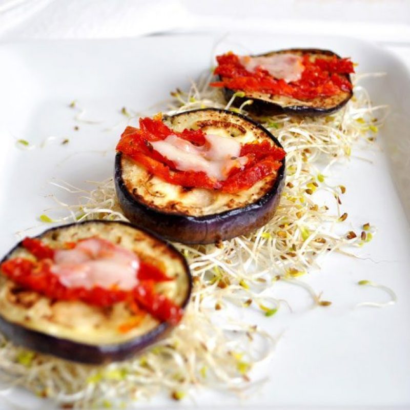 2. Place the eggplant slices on a baking sheet, top with sun-dried tomato, add Mozzarella and roast for a few minutes, until cheese is melted… Be generous with the cheese! Serve hot on a bed of sprouted seeds.