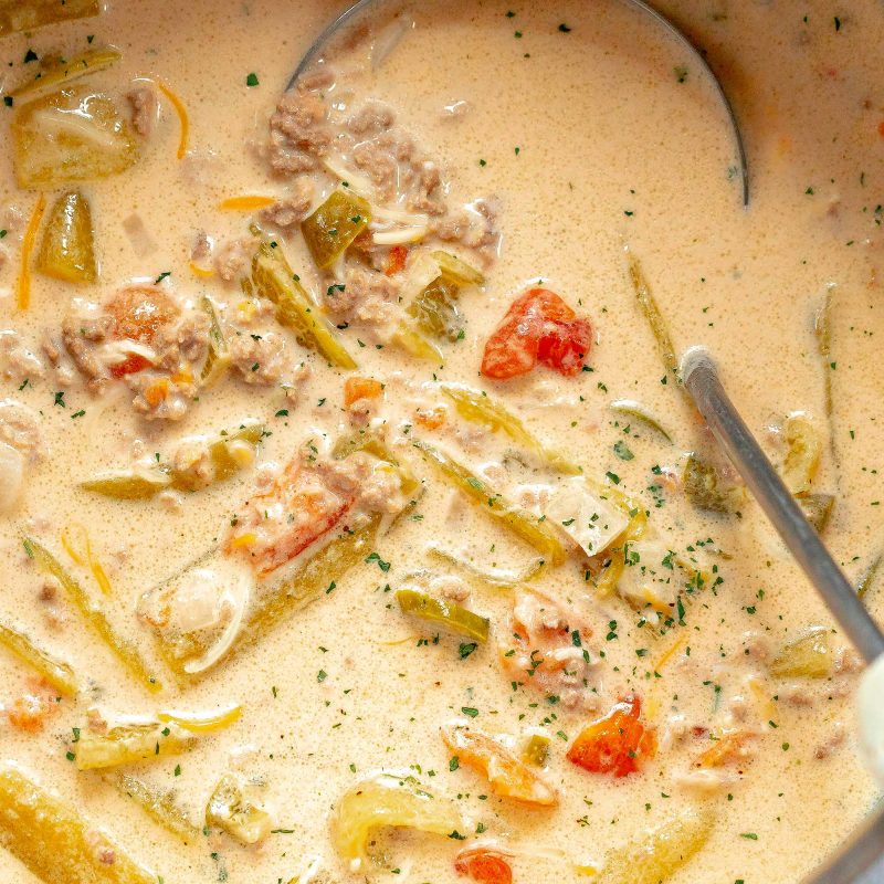6. Garnish with more shredded cheese and parsley and serve the green chile cheeseburger soup immediately. Enjoy!
