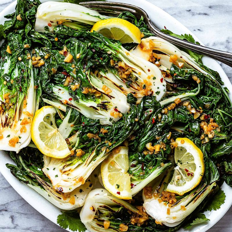 This baby bok choy recipe with garlic and ginger is simple, easy, healthy, and delicious. You can make it with just a handful of ingredients including ginger, garlic, butter, olive oil, sesame oil, lemon juice, and soy sauce. Ready in just 10 minutes, all you need is a hot grill and a pair of tongs.