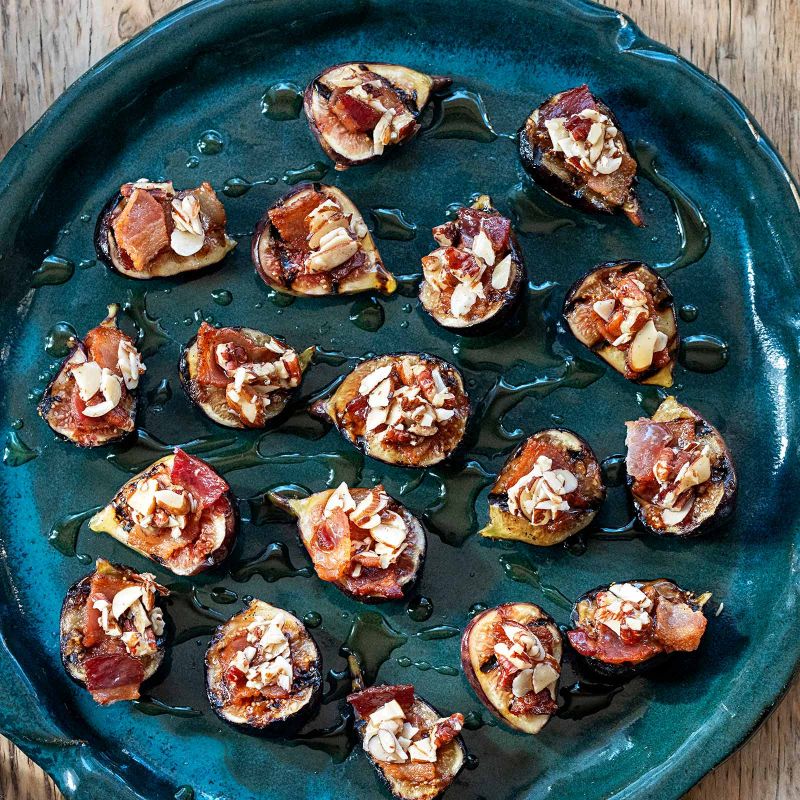 1. To make the grilled figs with bacon: Cook bacon pieces in a large nonstick skillet over medium-low heat, stirring often, until brown and crisp, 8–10 minutes. Using a slotted spoon, transfer crispy bacon to a small bowl lined with paper towels to absorb excess fat.