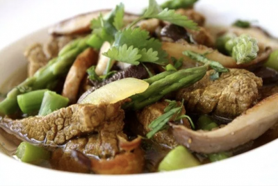 - Slice the veal into thin slices. In a skillet, heat a little oil and saute garlic and spices. Add veal and toss well to coat the meat. As soon as the meat colors, add the hot stock. Stir and cook 5 minutes. Adjust seasoning with salt and pepper. Add asparagus and mushrooms to warm them. Sprinkle with chopped cilantro at the time of serving.