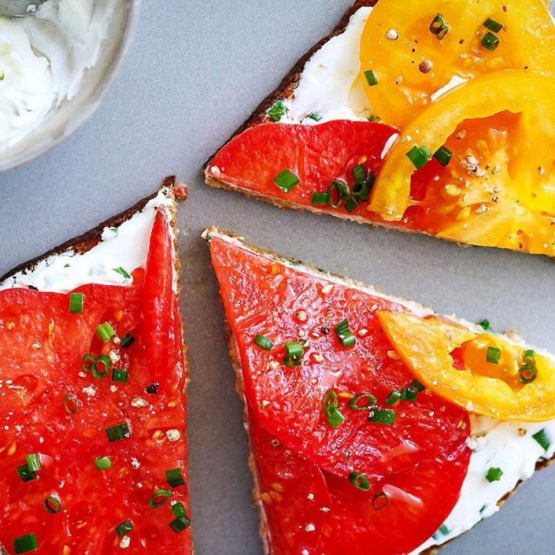 A super colorful tomato toast with cream cheese done in under 10 minutes for a great appetizer, snack or even breakfast. Ripe heirloom tomatoes are layered on top of crusty, toasted bread and smothered with herbed cream cheese. Super simple and so good!
