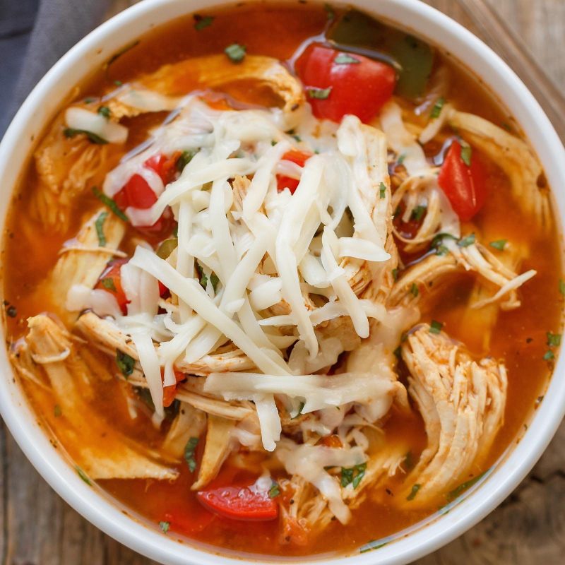 5. Divide the chicken fajita soup into bowls, top with your favorite shredded cheese (Mozzarella, Monterey Jack…) and garnish with fresh chopped cilantro and lime slices to brighten up the flavors, if you like. Enjoy!