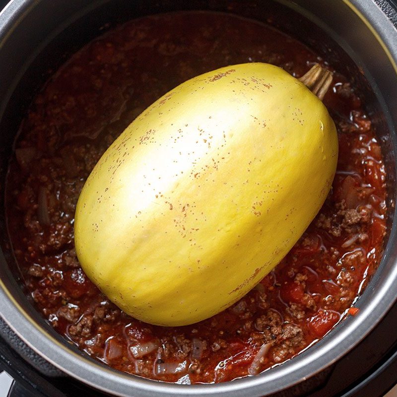 3. Poke the spaghetti squash with a fork and place it in the center of the sauce. Cover and cook on high pressure for 15-25 minutes or until the squash is easily pierced through with a fork (cooking time will depend on the size of your squash).
