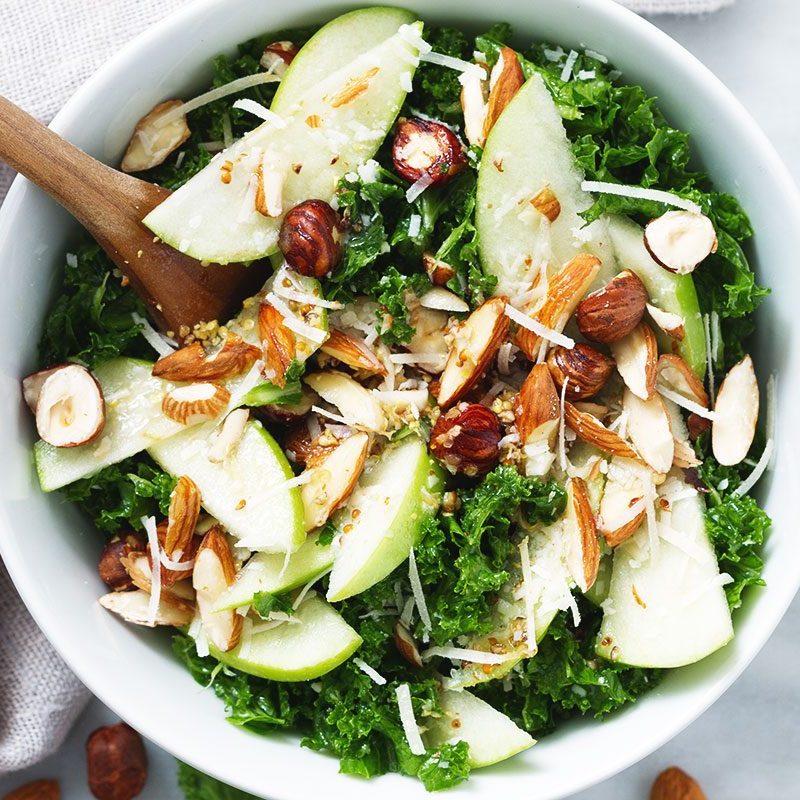 3. To assemble the salad, place the kale, apple slices, almonds, hazelnuts and Parmesan into a large bowl. Top with the dressing and toss to combine. Enjoy!