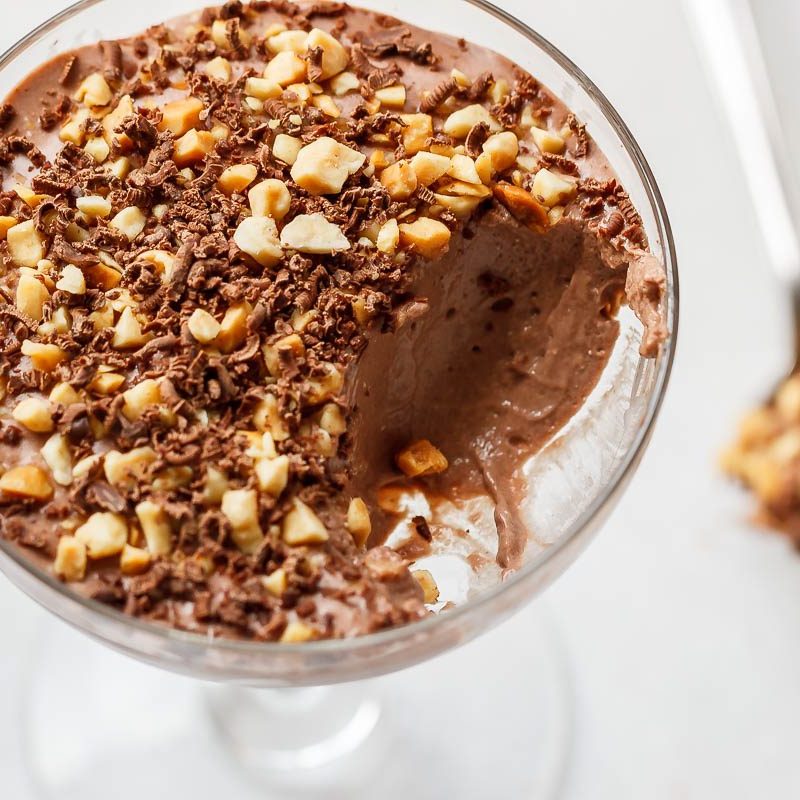3. Fold in cocoa powder and beat again until smooth, well combined and thick. Scoop into serving glasses and sprinkle with crushed peanuts (or almonds) and dark chocolate shavings.