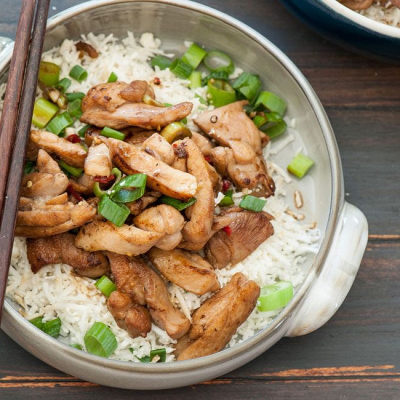 2. Heat wok or heavy skillet with vegetable oil or olive oil and add chicken breasts.
