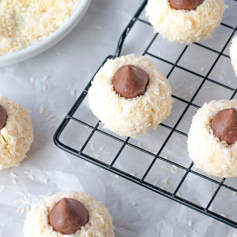 3. In the meantime, sift shredded coconut and 1 teaspoon sweetener in a shallow plate. Remove the coconut cheesecake dough from the freezer. Roll the dough into one inch balls. Roll each cream cheese coconut balls in shredded coconut then place on a baking sheet lined with parchment paper. Press a chocolate kiss into the center of each lemon coconut cheesecake balls – slight cracks are fine.
