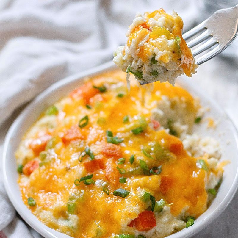 Talk about comfort food! This loaded cauliflower casserole is a healthier alternative to mashed potatoes, but far more flavorful! It offers the same texture with significantly fewer calories and carbs, and a much bigger dose of fiber and vitamin C! A low carb dish you can make ahead of time and finish off at the last minute for a really busy day!