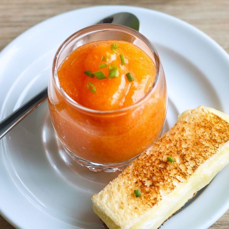 This super refreshing and wonderful Gazpacho can be whipped up in 15 minutes and make for a great snack, refreshing appetizer or palate cleanser. With the sweetness from the cantaloupe and carrots, and a little crunch from the grilled sandwiches, this combo is definitely a keeper for your luncheons.