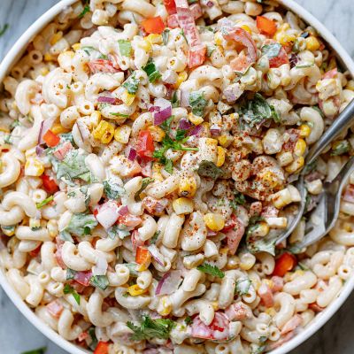 This is an easy, fresh, and satisfying pasta salad recipe! Made with fresh ingredients, including smoky grilled corn, red bell pepper, tomato, red onion, and herbs, and dressed up in a creamy Greek yogurt-based dressing. You’re guaranteed to make a hit at every cookout and potluck this Summer!