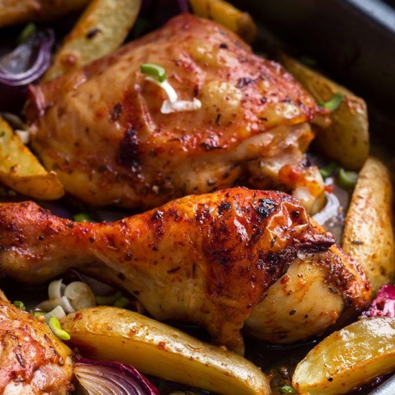 3. Place the chicken and potatoes in the oven to mid-low level and bake for 25 minutes. Add red onions then lower the oven to 350°F (180°C) and bake for 25 minutes more. Check for doneness, if the potatoes and chicken thighs are soft and easily pierced with a fork, they are done. If the chicken and vegetables have not browned up as much as you would like, just broil for 5 minutes, watching carefully not to burn the chicken.