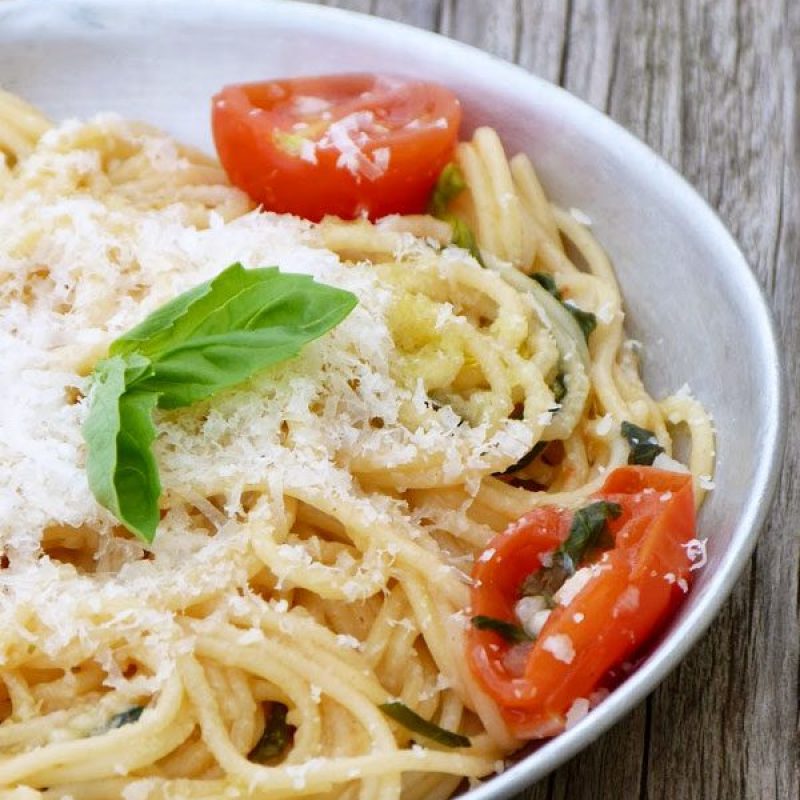 1. In a large pot, put together spaghetti, halved cherry tomatoes, onion and minced garlic, coarsely chopped basil, salt and pepper.