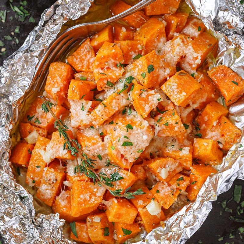Parmesan Sweet Potatoes in Foil Packets – Looking to make tender, extra-flavorful roasted sweet potatoes? We’ll show you how to bake sweet potatoes in foil packets using foil sheets in just a few simple steps. These baked sweet potatoes are coated with parmesan cheese and spices! Low-carb and gluten-free, parmesan sweet potatoes baked in foil are a quick and delicious side dish that works perfectly for holidays or even weeknight dinners. Enjoy!